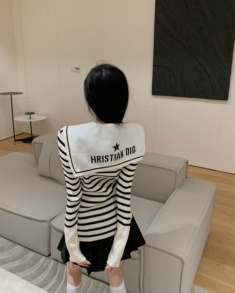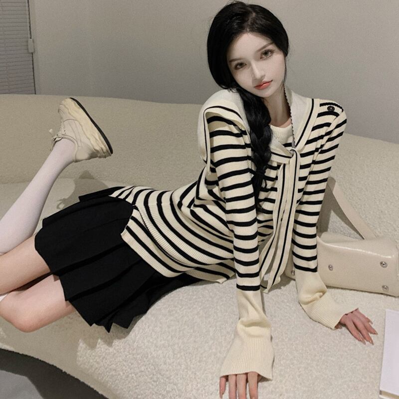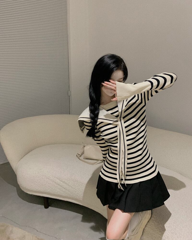 オータムブラウス セーター ネイビースタイルストライプカラースリム ロング 秋物 セブンプリンセス91978920442