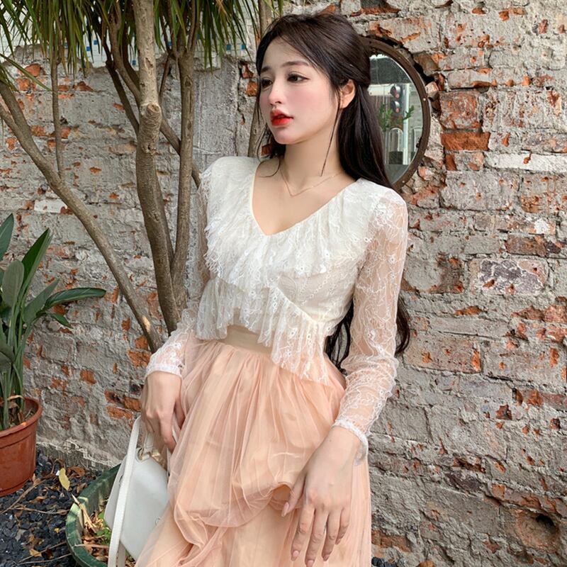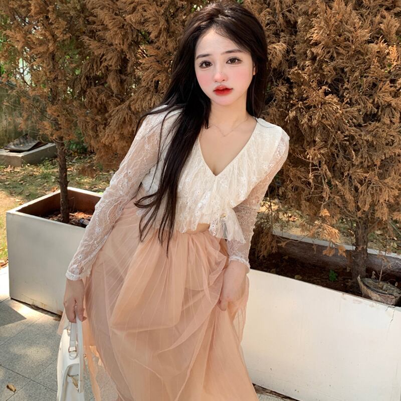 レースメッシュVネックオータムドレス ロング 秋物 セブンプリンセス78976714567