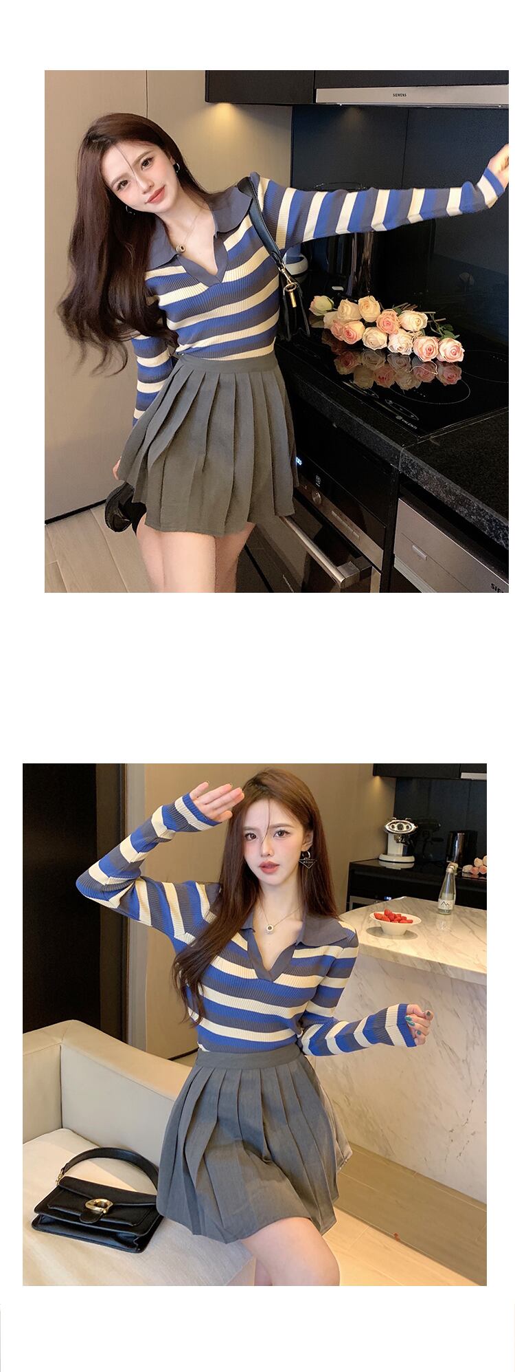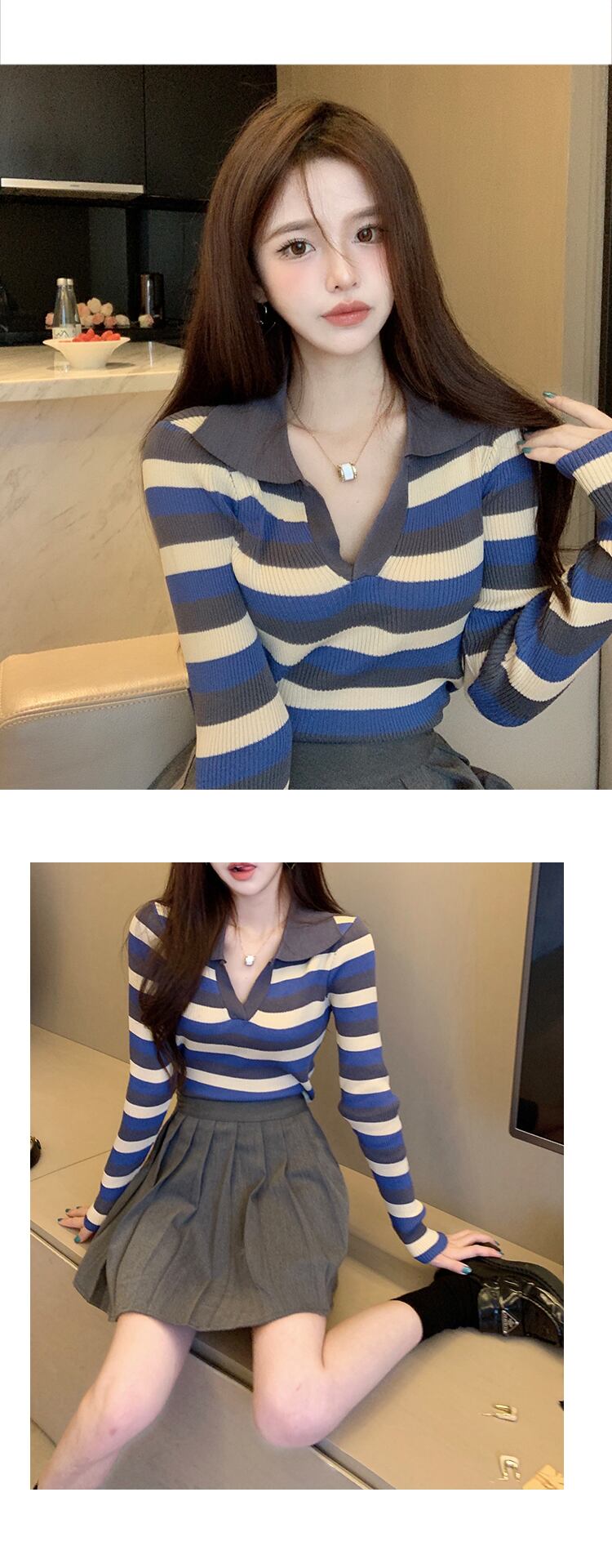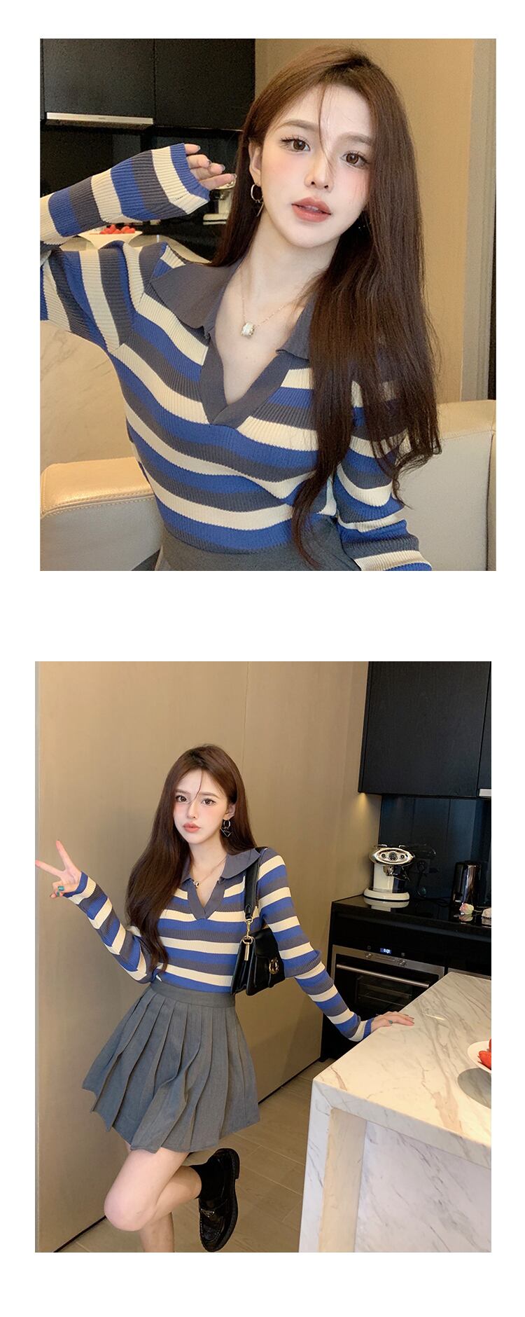 ショートVネックセーター オータムスタンダードストライプスリムシャツ プルオーバー トップス ロング レトロ 秋物 セブンプリンセス86889554246