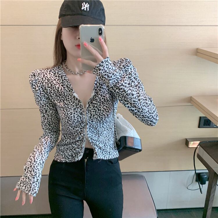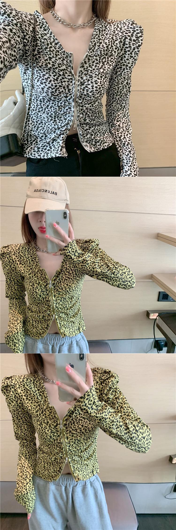 スリーブシャツ レディーススプリングオータムスタンダードスタイルレオパードプリント柄ショートジッパースリムトップス ロング レトロ 春物 秋物 セブンプリンセス59197563714