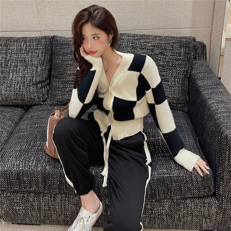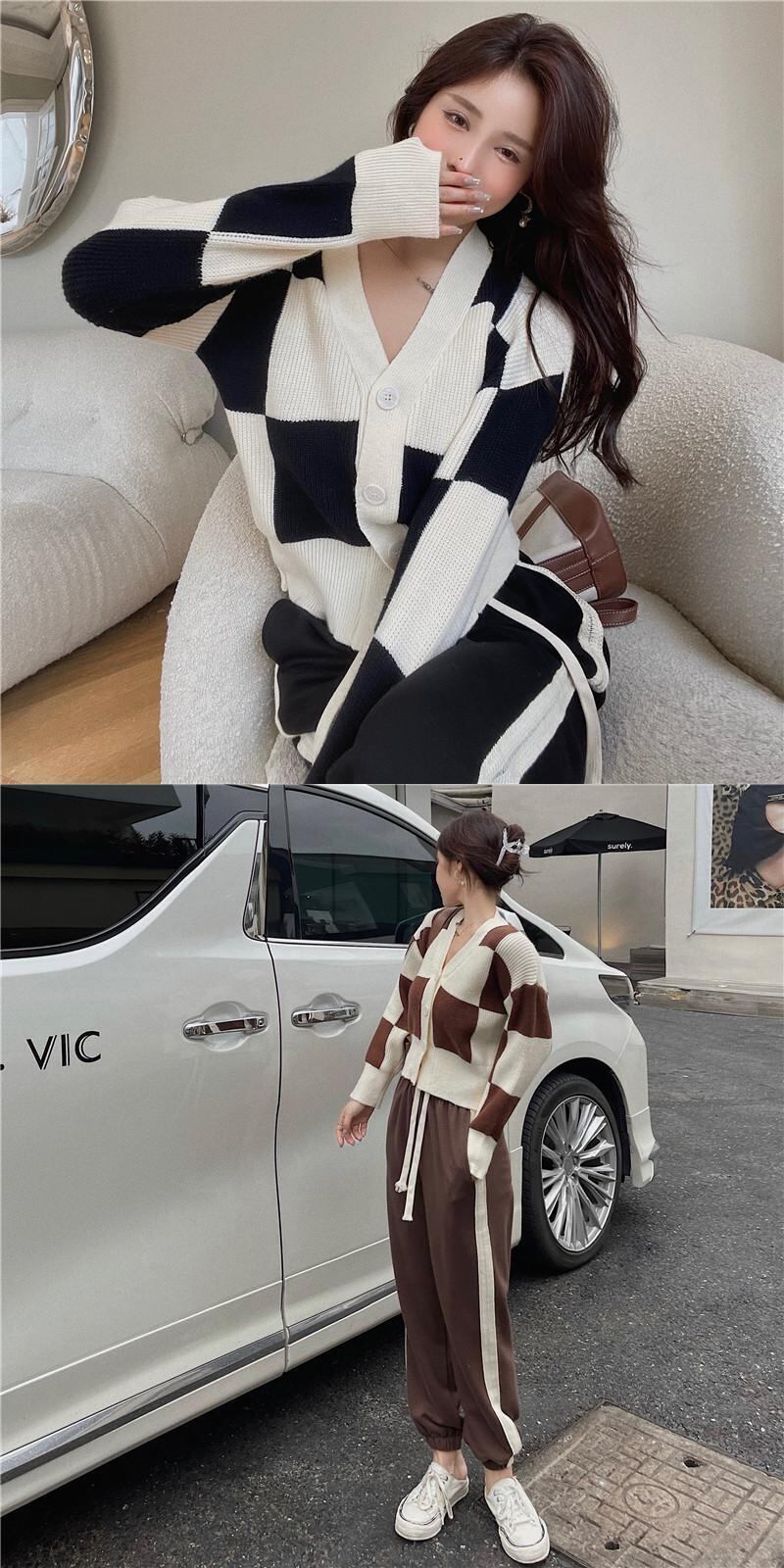 スタンダード格子柄カーディガンニットジャケット スプリングオータム薄手長袖スリーブトップス ショートVネックセーター ロング レトロ 春物 秋物 セブンプリンセス79295616554