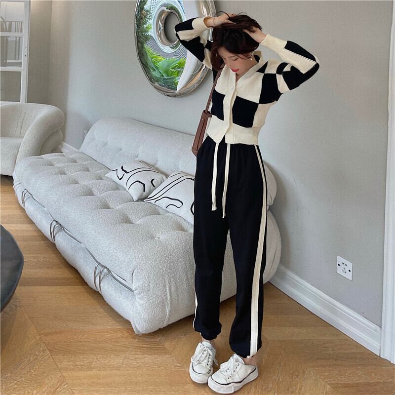 色:黒と白のセーター,黒いズボン,コーヒーカラーパンツ,コーヒーセーター