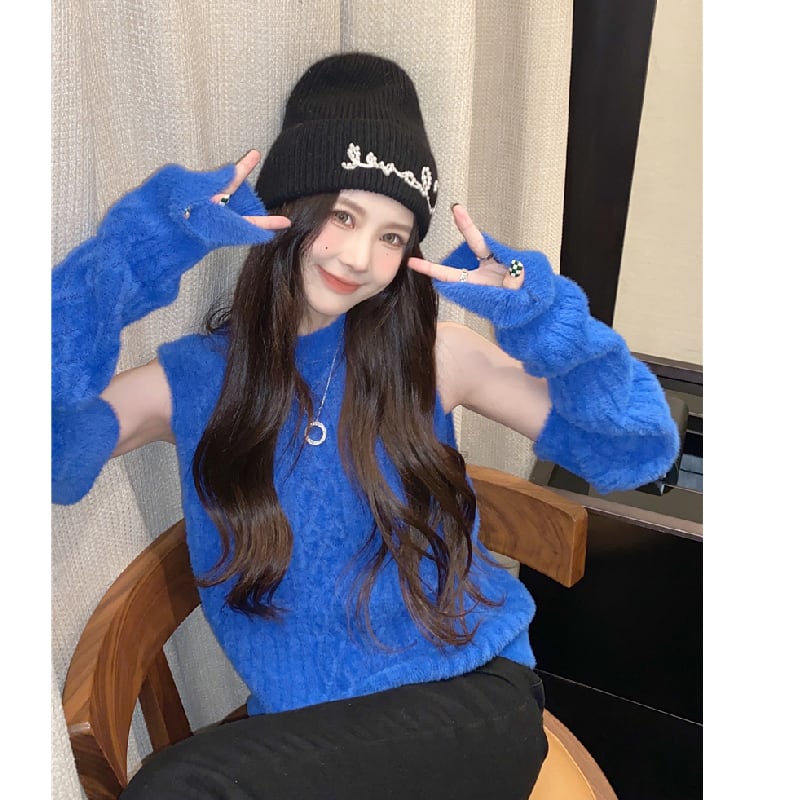 ホワイトブルーフェイクラウンドネックトップス 薄手ニットスリーブセーター レディース ファー Oネック セブンプリンセス14938972400
