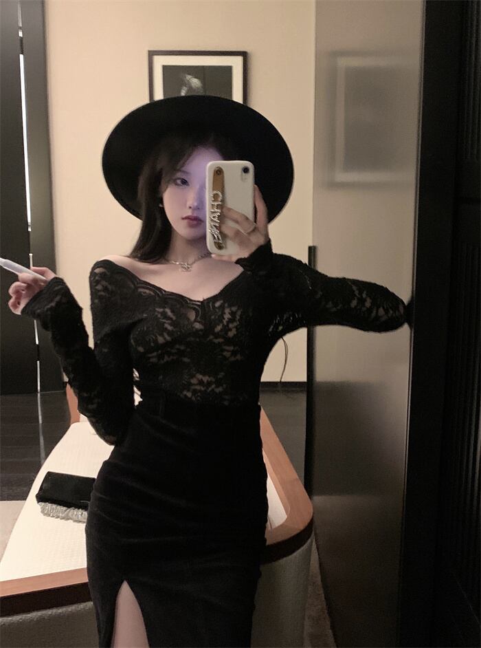Vネックレースシャツ ハイウェスト薄手スカート ベルト ハーネス セブンプリンセス63754919922