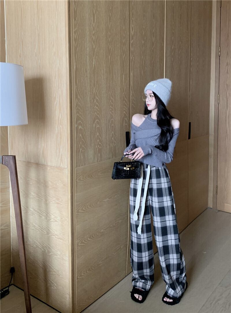 スリムセーター ハイウェスト格子柄ルーズパンツ ロング オフショルダー セブンプリンセス70796275380