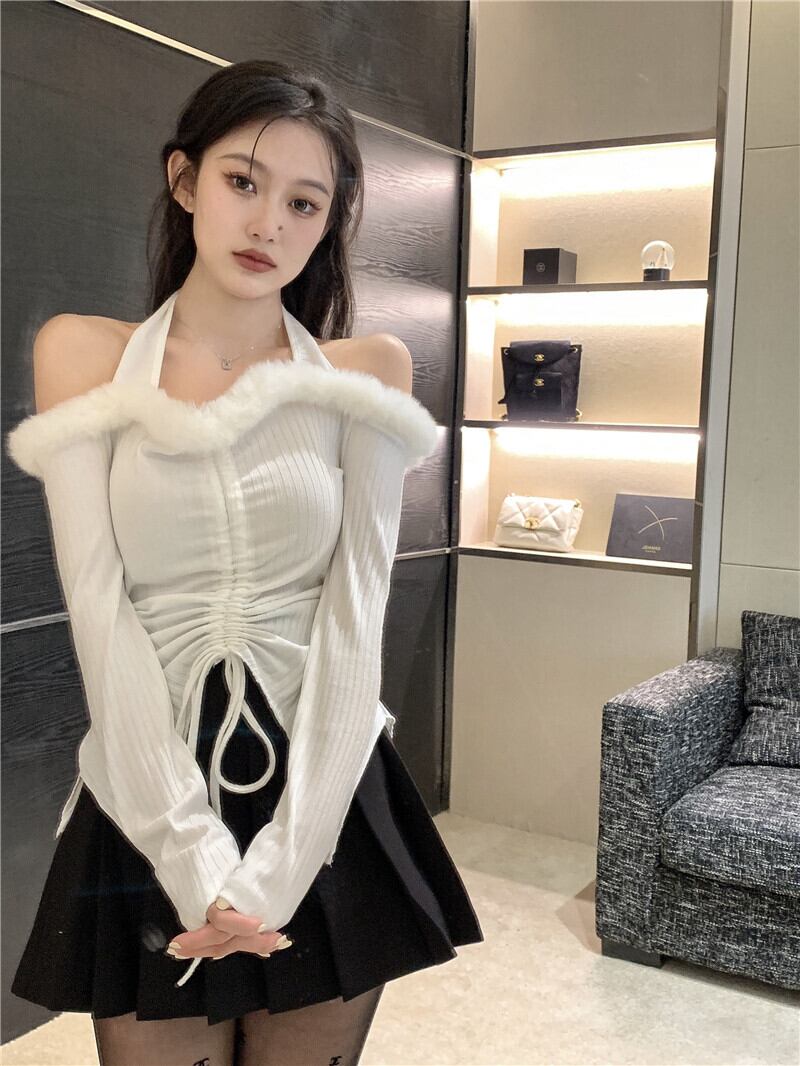 ファーカラーニットシャツ オータムウィンタースタンダードプリーツスリムTシャツ トップス ロング レトロ 秋物 冬物 セブンプリンセス55265352192