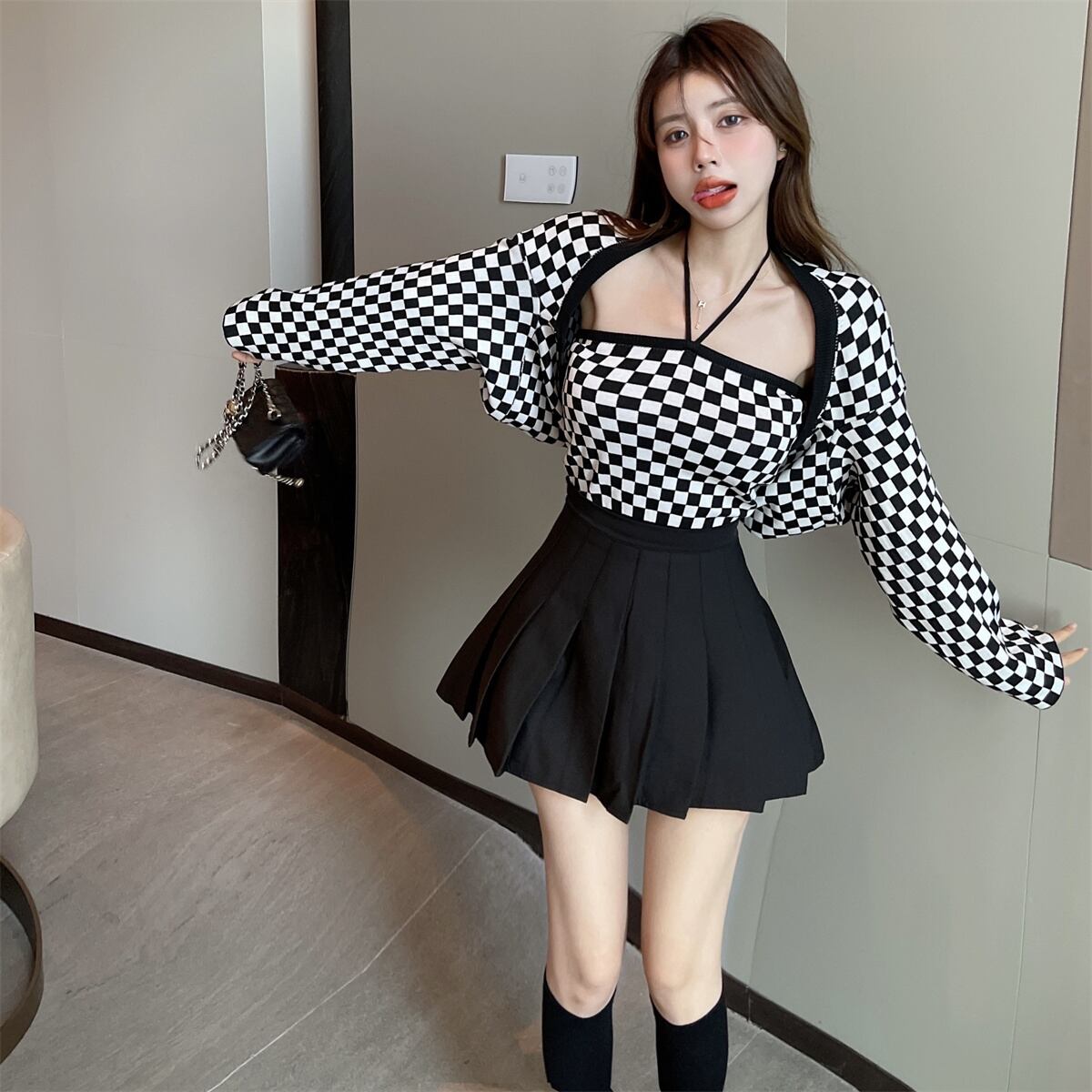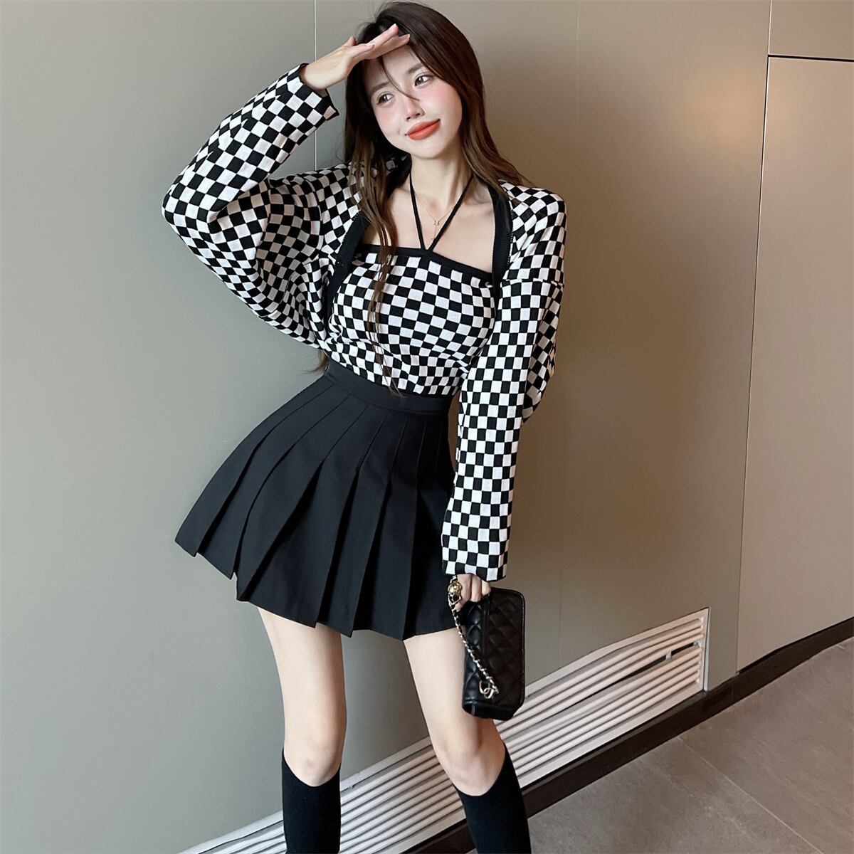 色:黒と白のチェックブラウススーツ,ブラックプリーツスカート
