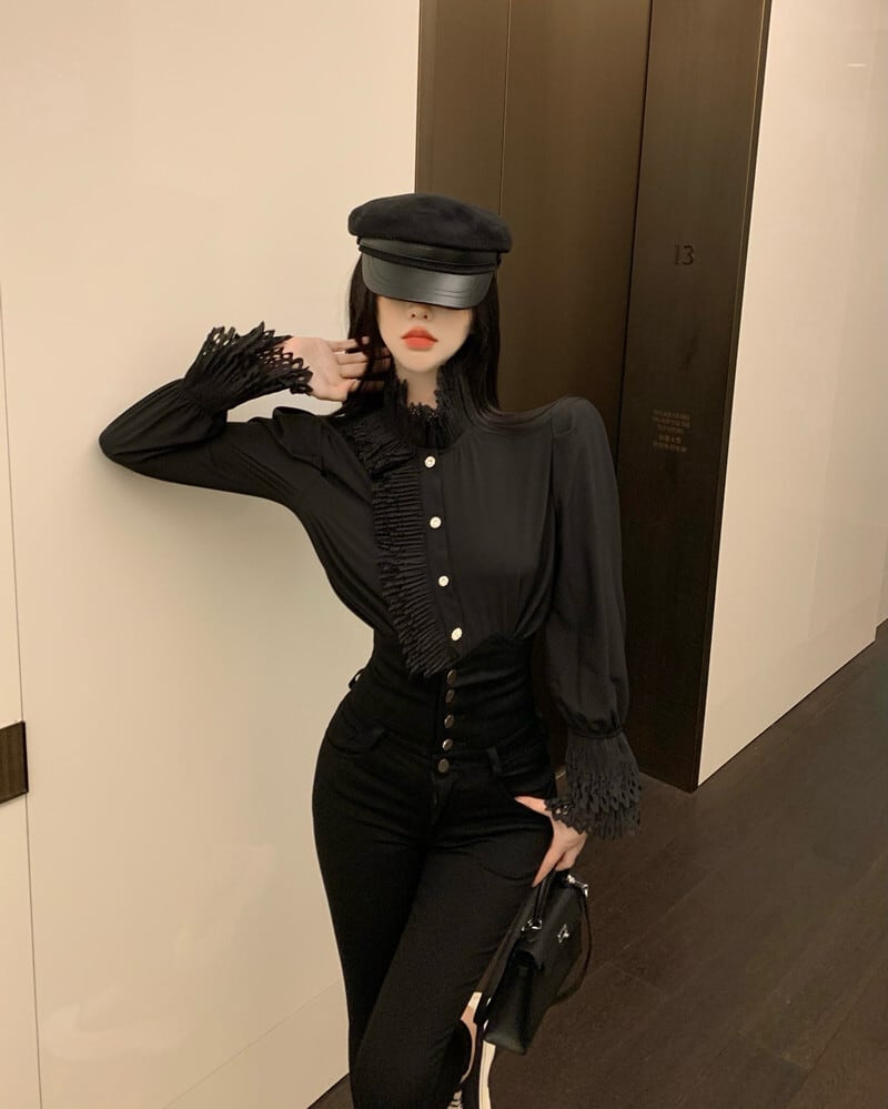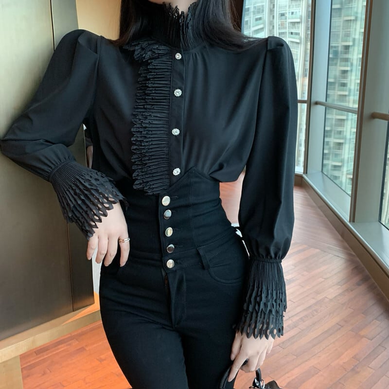 ブラックスリーブTシャツ シャツ オータムウィンタースタンダードカラー長袖トップス ロング レトロ 秋物 冬物 セブンプリンセス19367324380