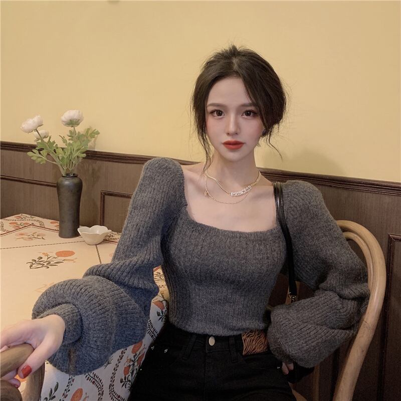 カラーセーター オータムウィンタースタンダードルーズ薄手スリーブショートトップス ロング レトロ 秋物 冬物 スクウェア セブンプリンセス68064808349